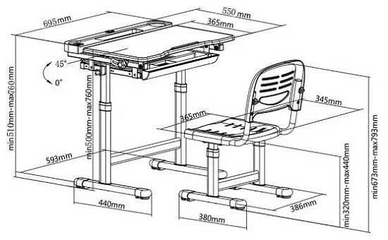 Поверхность учебного стола можно наклонять до 45 ° для удобного письма, чтения и рисования.