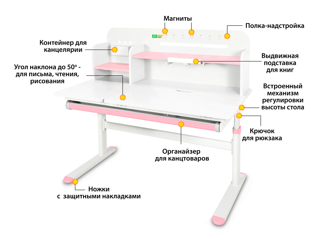 Конструкция стола крепкая и надежная благодаря металлическому каркасу.Растущая парта прослужит вам долго! Цветные защитные накладки на ножках и выдвигающемся органайзере добавят акцент в детский интерьер.