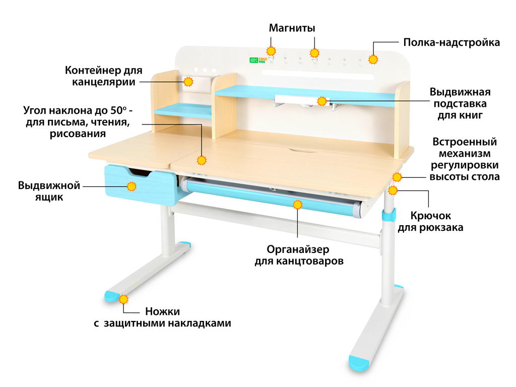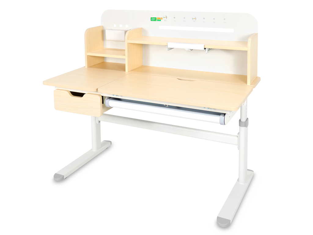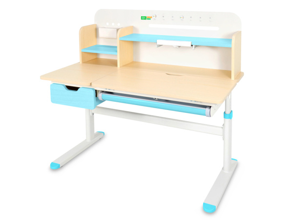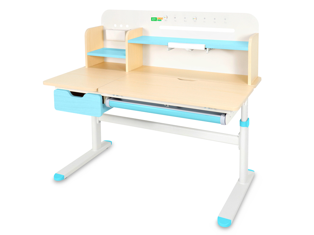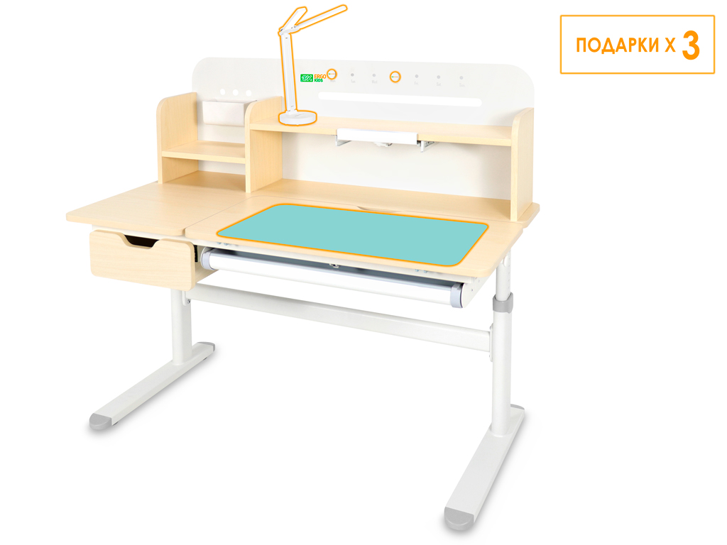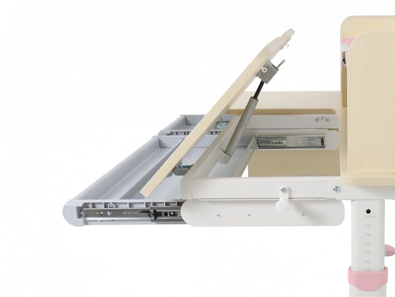 Регулировка высоты столешницы 52-76 см. Высота стола регулируется с помощью механической ручки, что дает возможность легко настроить парту под рост ребенка. Стол с трансформирующейся столешницей, которая изменяет угол наклона до 50 градусов с помощью механизма газлифт. Вы можете установить оптимальный угол наклона столешницы для чтения, письма или рисования.