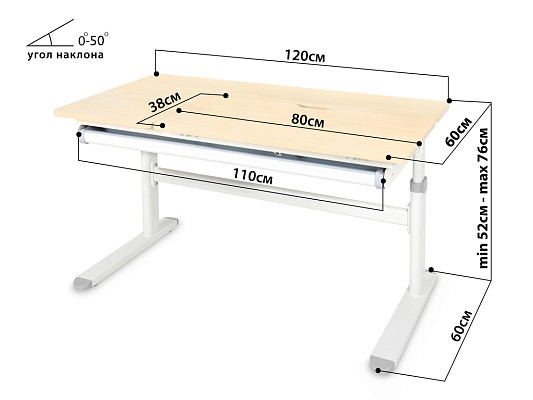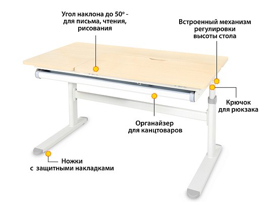 Регулировка высоты столешницы 52-76 см. Высота стола регулируется с помощью механической ручки, что дает возможность легко настроить парту под рост ребенка. Стол с трансформирующейся столешницей, которая изменяет угол наклона до 50 градусов с помощью механизма газлифт. Вы можете установить оптимальный угол наклона столешницы для чтения, письма или рисования. Сбоку, у стола крепится крючок, на который ребенок может повесить портфель или спортивную форму.