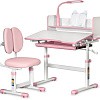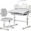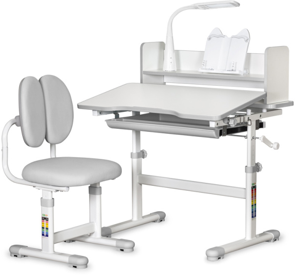 Высота столика изменяется механизмом плавной регулировки специальной ручкой, позволяющей с легкостью устанавливать парту в соответствии с ростом ребенка. Кресло регулируется по высоте и фиксируется винтами. На мощных металлических ножках есть мебельные опоры, помогающие установить комплект на неровных поверхностях.