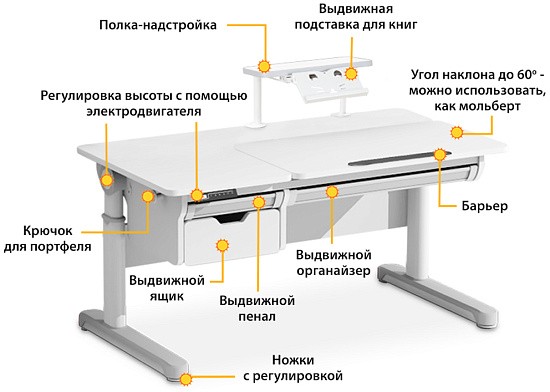Для регулировки высоты парты используется электропривод. Благодаря ему изменить высоту парты с легкостью сможет даже ребенок. Вы можете запомнить четыре наиболее часто используемых значений высоты парты для более простого управления.