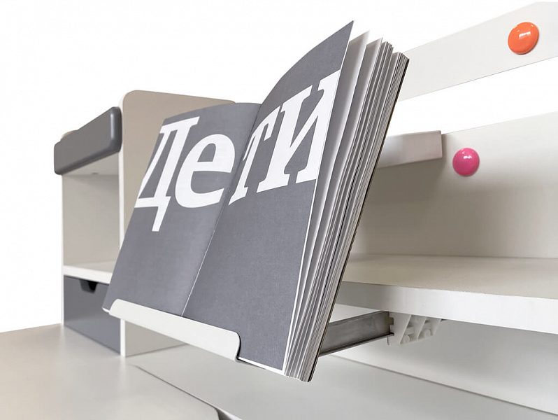 Для удобного чтения и переписываня тредусмотрена подставка для книги с изменяемым углом наклона. Когда она не нужна, ее можно сложить и задвинуть.