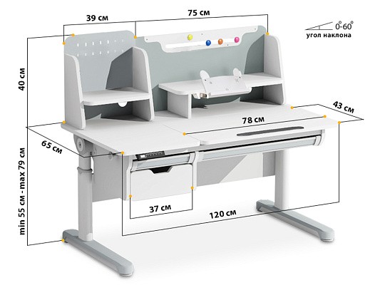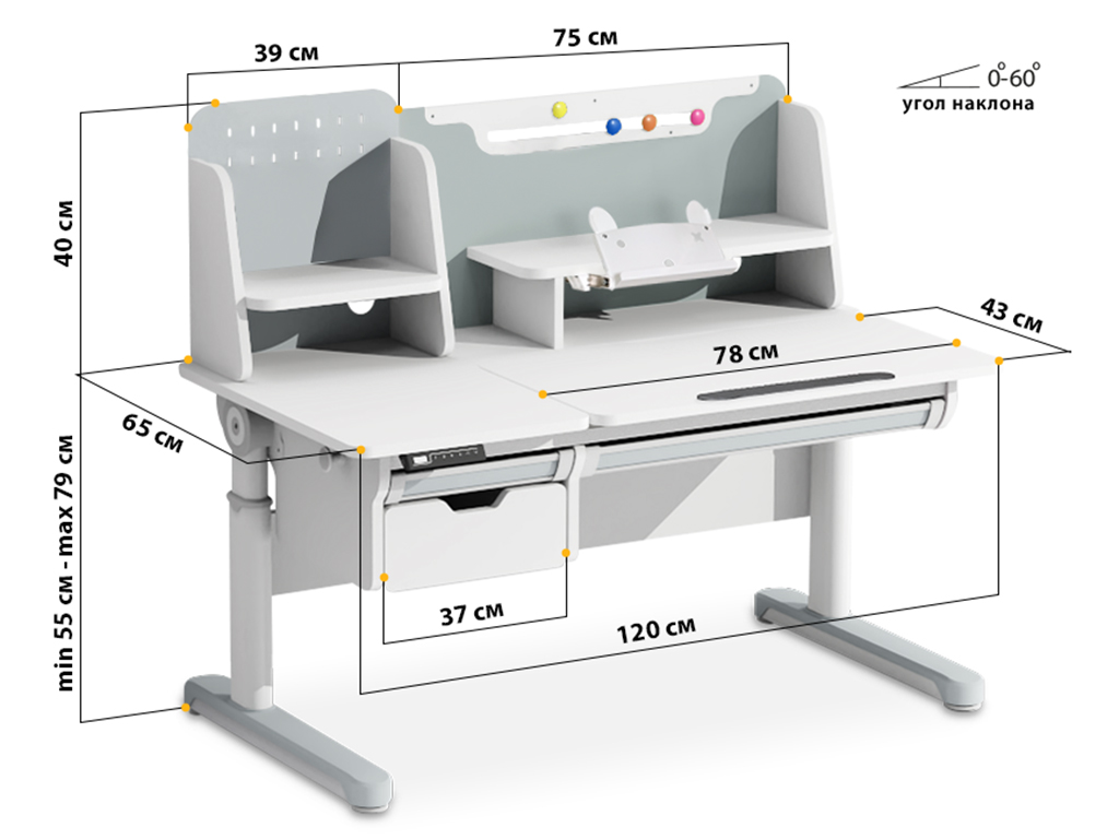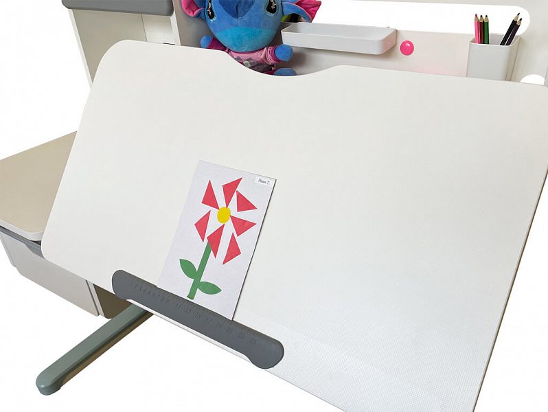 Для формирования хорошего почерка неодходим наклон столешницы около 10 градусов. Для рисования красками столешница должна быть горзонтальной, а для рисования карандашом удобен наклон столешницы 45 градусов. Ребенок без труда сможет установить нужный наклон столешницы благодаря удобному и надежному газ. лифту.