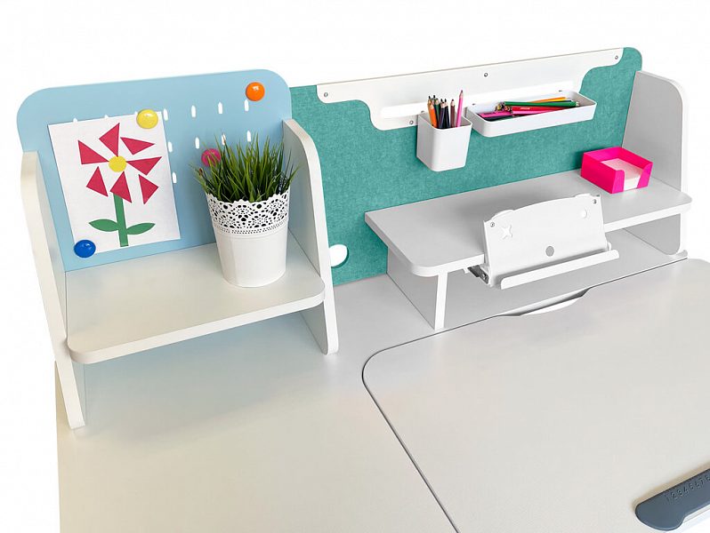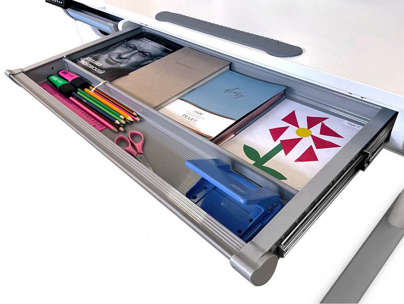Вместительный выдвижной органайзер расположен под столешницей. В нем удобно хранить ручки и тетрадки, которыми ребенок пользуется наиболее часто.