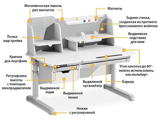 Для регулировки высоты парты используется электропривод. Благодаря ему изменить высоту парты с легкостью сможет даже ребенок. Вы можете запомнить четыре наиболее часто используемых значений высоты парты для более простого управления.