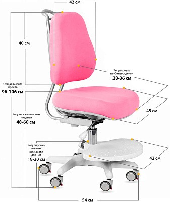 Особенностью модели является наличие подставки для ног с возможностью регулировки высоты. Благодаря такой функции кресло можно использовать вместе со стандартным нерегулируемым столом.