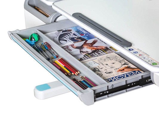 Важной особенностью данного стола является наличие сменных цветных накладок. Приобретайте стол серого цвета и получите на выбор голубые, либо розовые накладки. Накладки меняются на ножках, пластиковом выдвижном органайзере, выдвижном ящике и полочке на надстройке. Меняйте цвет декора в зависимости от настроения вашего ребенка!