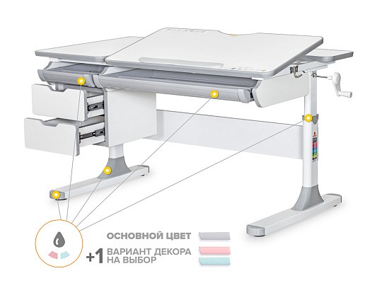 Одной из важных особенностей данной модели является наличие сменных цветных накладок в подарок! Приобретайте комплектацию стола Lite или с полкой BD S-50 в сером цвете и получите розовые либо голубые накладки совершенно бесплатно! Накладки меняются на ножках, пластиковом пенале и выдвижном органайзере.