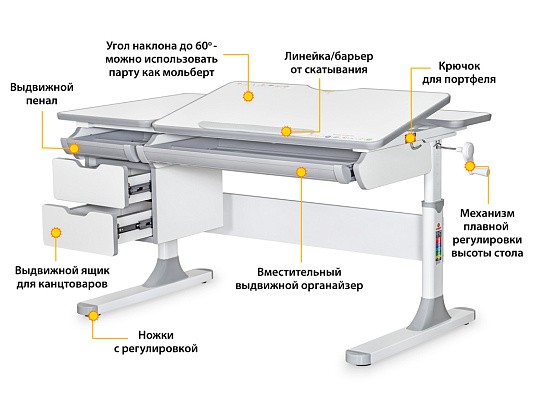 Наличие съемного прорезиненного барьера на столешнице предотвращает скатывание предметов во время выполнения домашнего задания.
