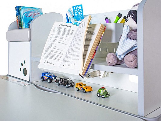 Удобным дополнением для стола является полка - надстройка с двумя полочками поменьше и шкафчиком с металлической дверцей. Задняя стенка надстройки также металлическая. Ее можно использовать для закрепления заметок магнитами. Для удобного хранения мелких письменных принадлежностей на стенке крепятся два подвесных контейнера. Прекрасным дополнением к полке является прочная выдвижная подставка для книги с изменяемым углом наклона. При необходимости подставка убирается.