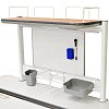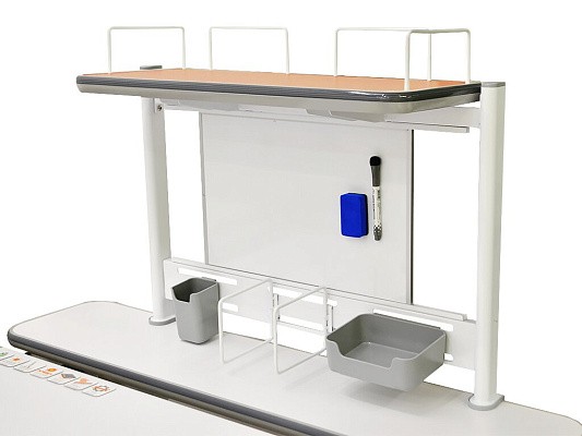 По периметру рабочей поверхности размещены пеналы для хранения канцтоваров. По бокам размещены пластиковые пеналы-накладки, а cнизу, вдоль столешницы, размещены металлические пеналы.
