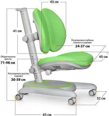 Главная особенность кресла - увеличенный диапазон регулировки глубины сидения за счет подвижной спинки. Глубина спинки плавно регулируется специальным механизмом. Глубина сиденья – ручкой -фиксатором. Кресло подойдет для детей от 3х лет до взрослого возраста.