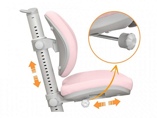 У кресла независимая регулировка высоты спинки и сиденья. Регулировка осуществяется с помощью специальных винтов на металлической несущей трубе Глубина сиденья регулируется ручкой -фиксатором. Кресло подойдет для детей от 3х лет до взрослого возраста.