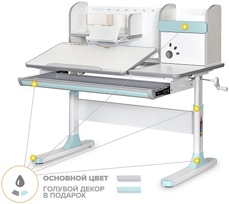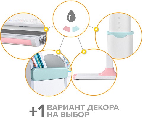 Важной особенностью данного стола является наличие сменных цветных накладок. Приобретайте полную комплектацию стола в сером цвете и получите розовые либо голубые накладки совершенно бесплатно! Накладки меняются на ножках, выдвижном органайзере и полке надстройке. Меняйте цвет в зависимости от настроения!
