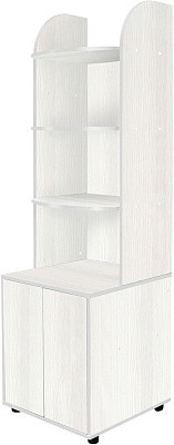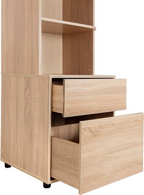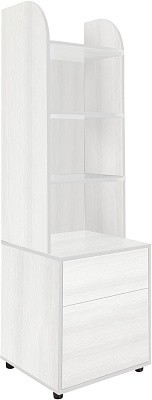 Комплект состоит из двух стеллажей с закругленными полками и двух вместительных тумб. Одна из тумб с ящиками, вторая - с распашными дверцами. Ящики и дверцы открываются простым нажатием на них. Навесная полка крепится между стеллажей. Комплект отлично впишется в интерьер любой комнаты, не только детской. Школьные принадлежности, канцелярия и аксессуары разместятся внутри ящиков.