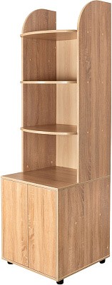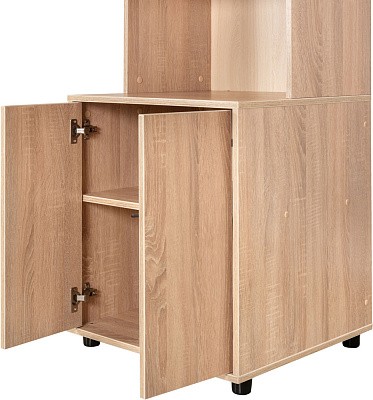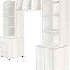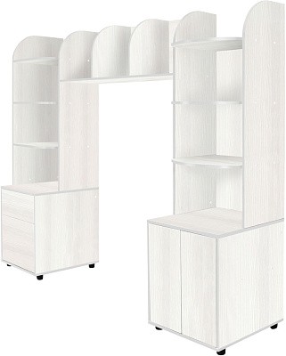 Комплект состоит из двух стеллажей с закругленными полками и двух вместительных тумб. Одна из тумб с ящиками, вторая - с распашными дверцами. Ящики и дверцы открываются простым нажатием на них. Навесная полка крепится между стеллажей. Комплект отлично впишется в интерьер любой комнаты, не только детской. Школьные принадлежности, канцелярия и аксессуары разместятся внутри ящиков.