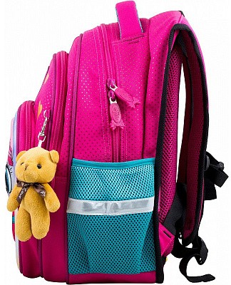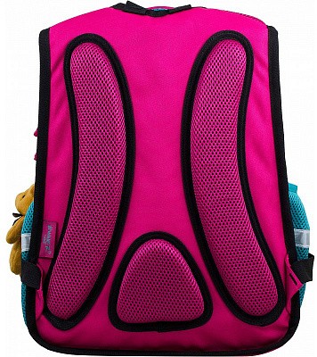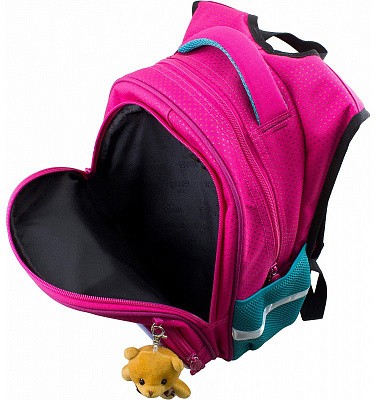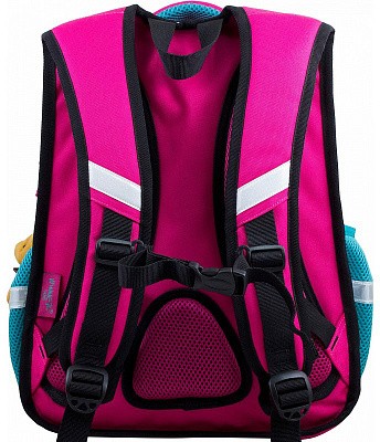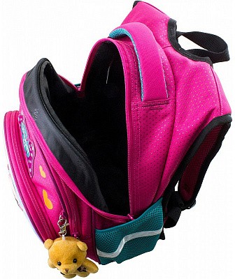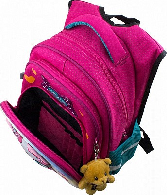 В школьном рюкзаке два основных отделения и карман-органайзер. Основное отделение с 2 двумя разделителями и резинкой для крепления школьных принадлежностей. Второе отделение без наполнения. Спереди вместительный карман на молнии украшенный объёмной 3D картинкой с органайзером для письменных принадлежностей. По бокам карманы-сеточки на резинке.